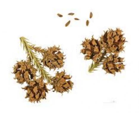 -Fruits: Cônes lécanies de 3 cm de diamètre avec 20-40 écailles légèrement imbriquées qui portent, sur leur face inférieure des bosses blanches