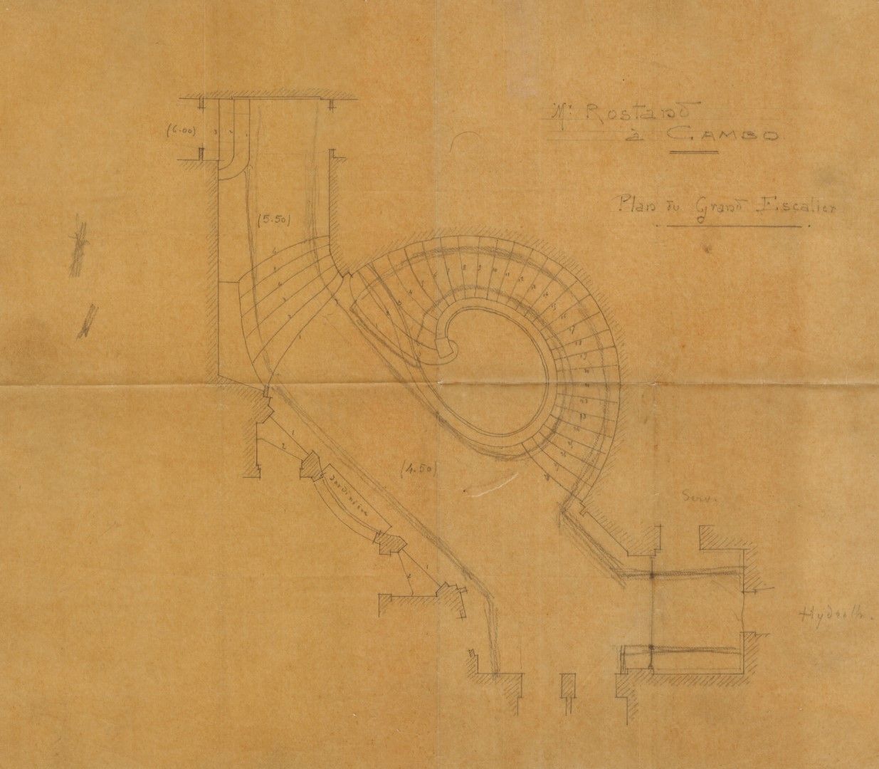 Le grand escalier a été conçu par Edmond Rostand. Albert Tournaire, le talentueux architecte d'Arnaga l'a mis en plan. Les photographies d'époque le montrent réalisé. Il ne présente plus aujourd'hui le même aspect, ayant été modifié par les propriétaires suivants.